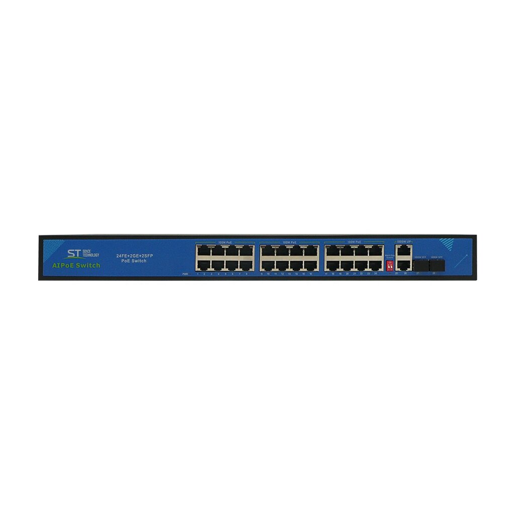 Источник питания ST-S240POE (2G/2S/300W/А) PRO, (версия 4) , Switch POE 24-х портовый для обеспечения проводных сетей напряжением 48В , защита от КЗ, AI PoE, VLAN, Грозозащита, PoE порты: 24 х (10/100 Мбит/с), UpLink порты: 2 х(10/100/1000 Мбит/с), SFP порты: 2 х (10/100/1000 Мбит/с), Max.пропускная сп-ть: 100 Мбит/канал (PoE порты), 1000Мбит/канал (UpLink и SFP порты), Uвых: 48 (±10%), Р(ном) каждый порт (Вт): 12,5 Вт, Р(макс) каждый порт (Вт): 30 Вт, Р(сумм) общая (Вт): 300 Вт, Тип РоЕ: А, Коммутационная способность (Гбит/с): 12,8, AI PoE(watchdog), VLAN, Extend, Система охлаждения: активная, Активное РОЕ Металл, Температура эксплуатации: От -45°C до +55°C, Габариты изделия, мм.: 440х190х45.
